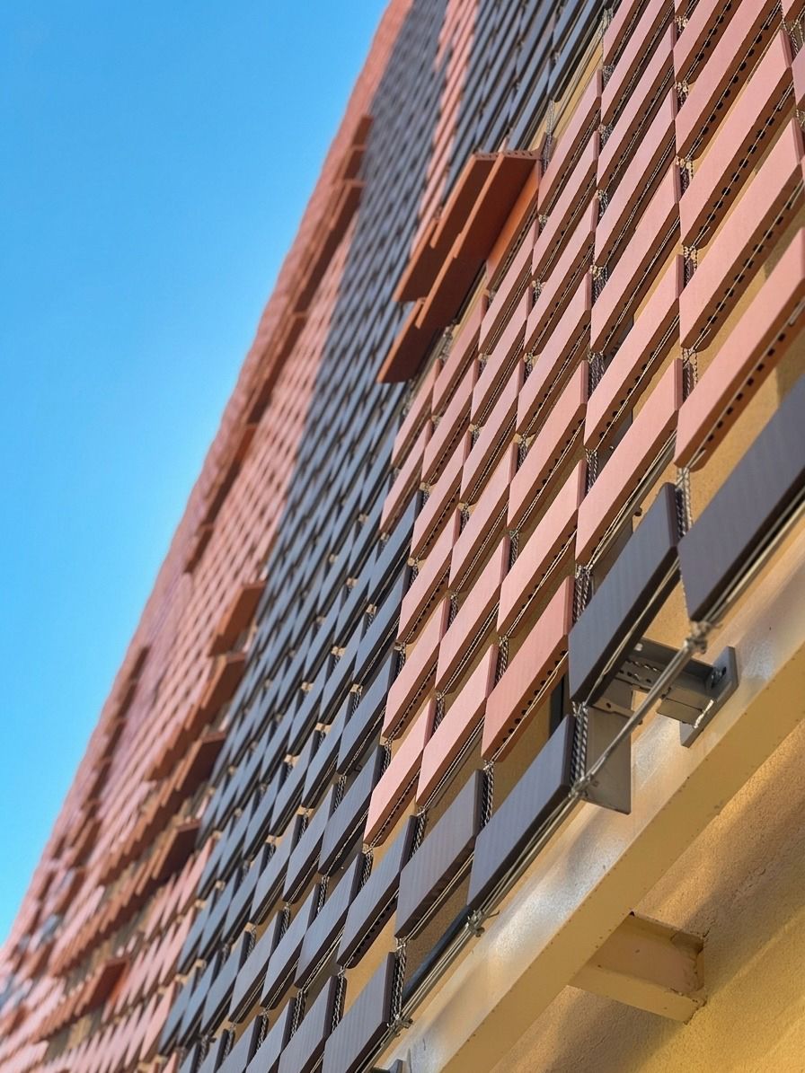Pel que fa a l’envolupant de l’edifici, destaquen la substitució de les fusteries exteriors, l’execució d’un sistema SATE amb llana mineral, la incorporació d’una façana de malla ceràmica, la renovació completa de la coberta i la instal·lació d’un sistema d’energia fotovoltaica per a autoconsum, contribuint de manera significativa a la millora de l’eficiència energètica de l’edifici.