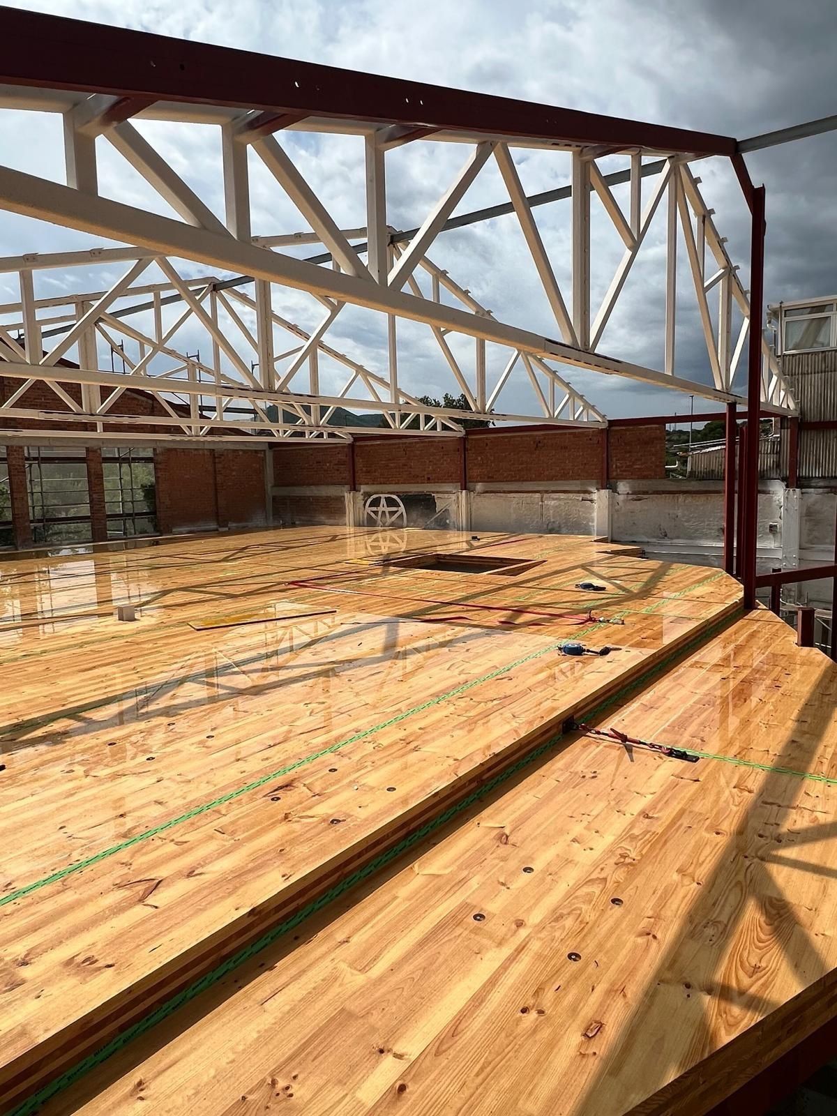 Hem finalitzat la fase inicial, amb el muntatge de l’estructura metàl·lica d’encavallades —algunes aprofitades i d’altres de nova fabricació—, així com el forjat i la coberta en panells de fusta CLT.